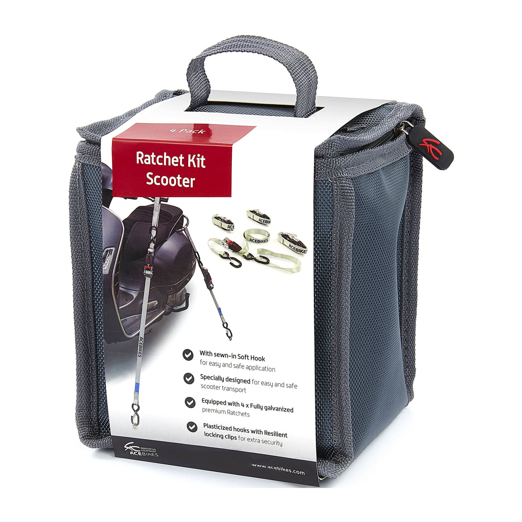 Chcesz przewieźć swój skuter? Chcesz go zabezpieczyć i zastanawiasz się w jaki najlepszy sposób? Czteroczęściowy zestaw pasów mocujących AceBikes w praktycznej torbie do przechowywania będzie idealnym rozwiązaniem